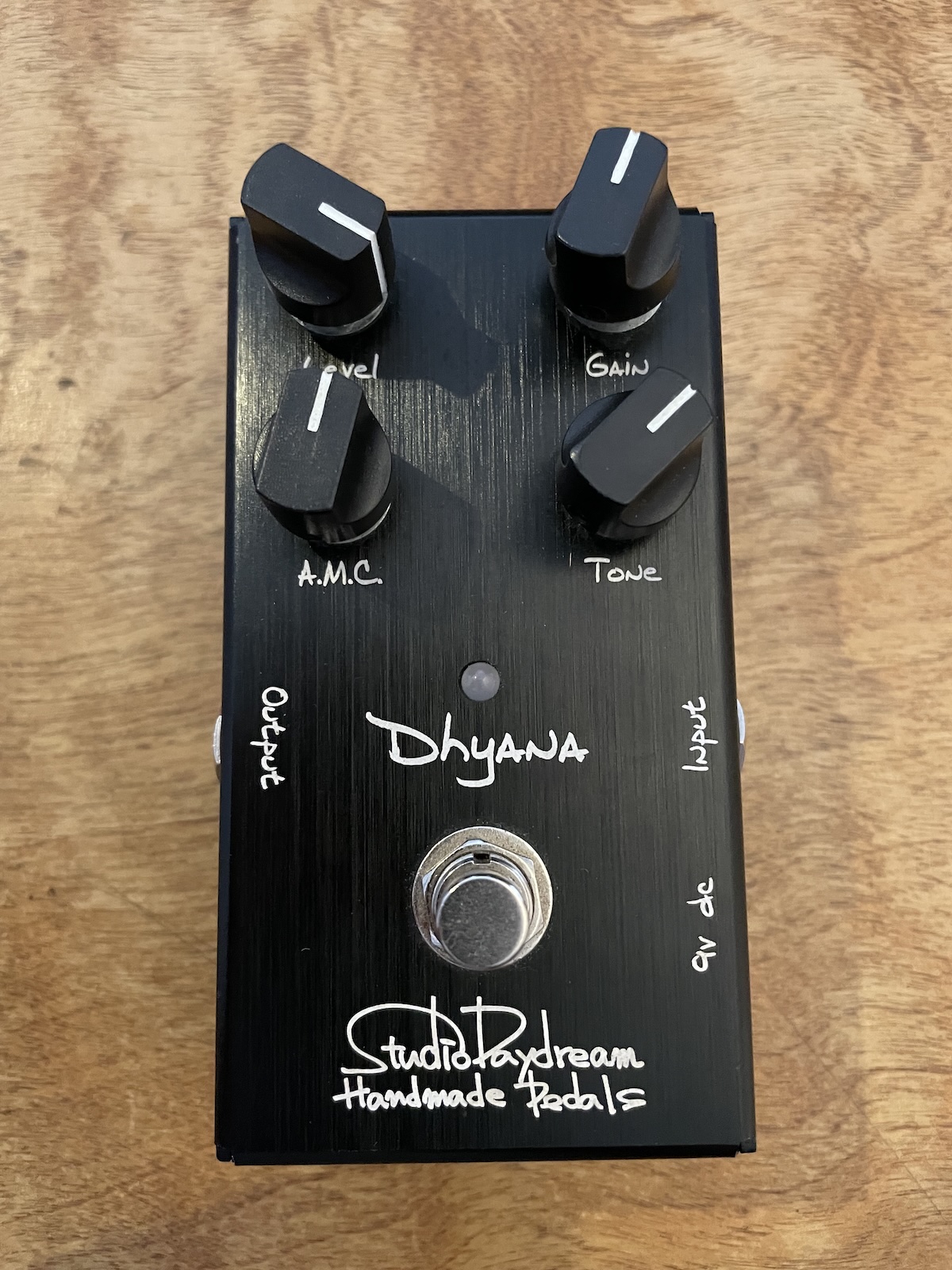 The Studio Daydream Dhyana is an overdrive pedal based on the Dumble built Smokey Signal Tubeless Overdrive, specifically the Alpha tuning model made popular recently by John Mayer. This hand made boutique Japanese pedal, created by designer Taku Sakashita, was designed and built as a “Dumble In A Box” type of pedal, made to compliment your guitar while driving your amp. Providing a rich, full sound at every setting while making your tone sing and amp break up perfectly. Aside from the usual Level, Tone and Gain controls, it features an A.M.C. knob, which stands for Amplifier Matching Control. This parameter adjusts the harmonics and gain in a unique way, blending with the Gain control for a host of distinctive tones and levels of overdriven prestige.